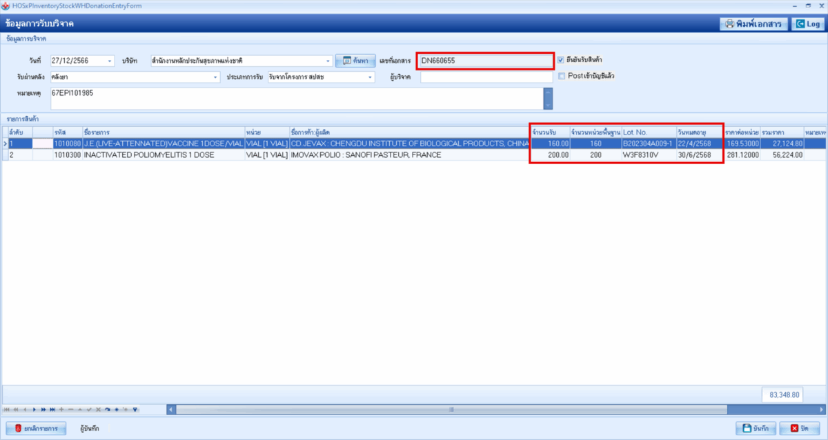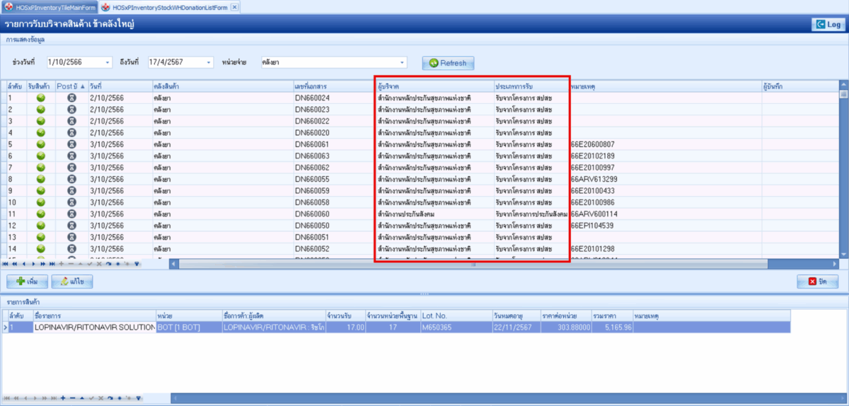 แสดงหน้าจอรับบริจาคสินค้าเข้าคลังใหญ่