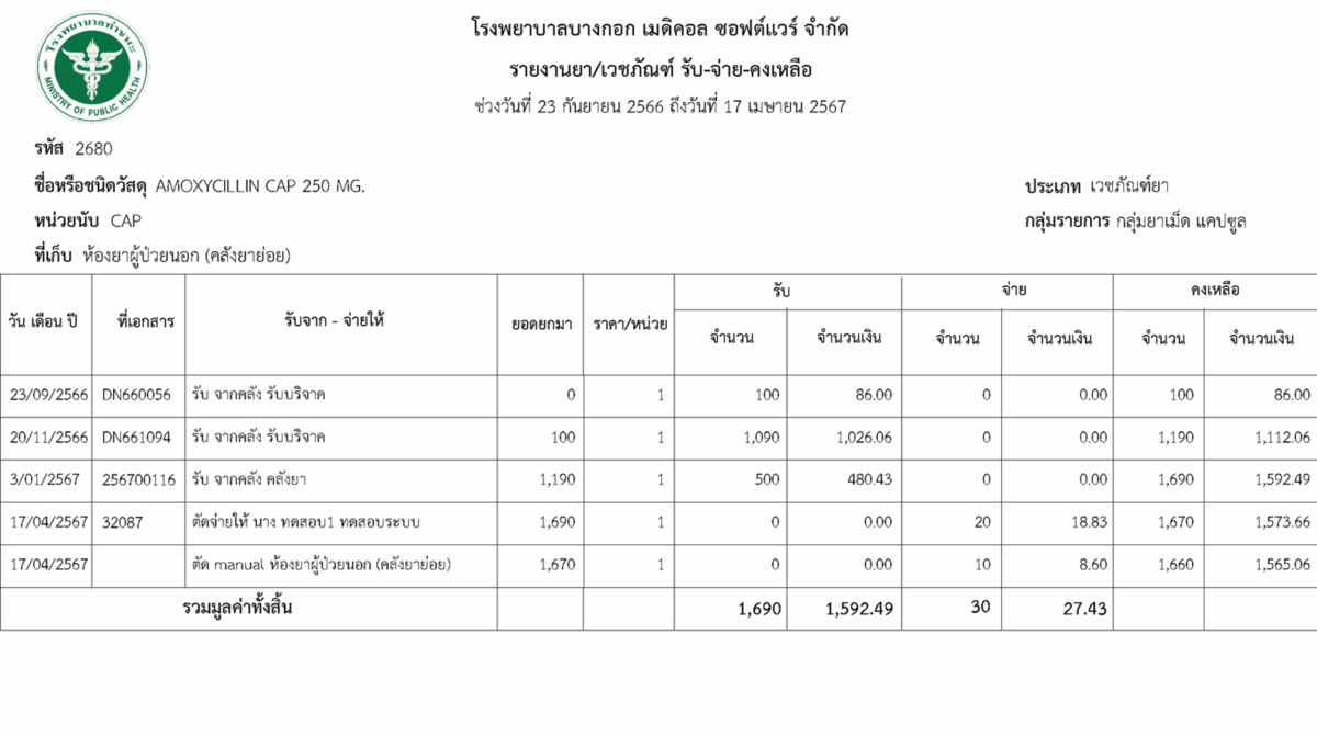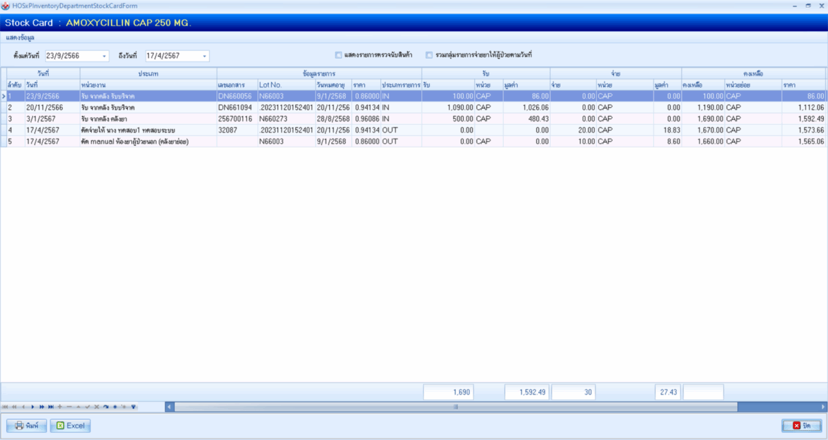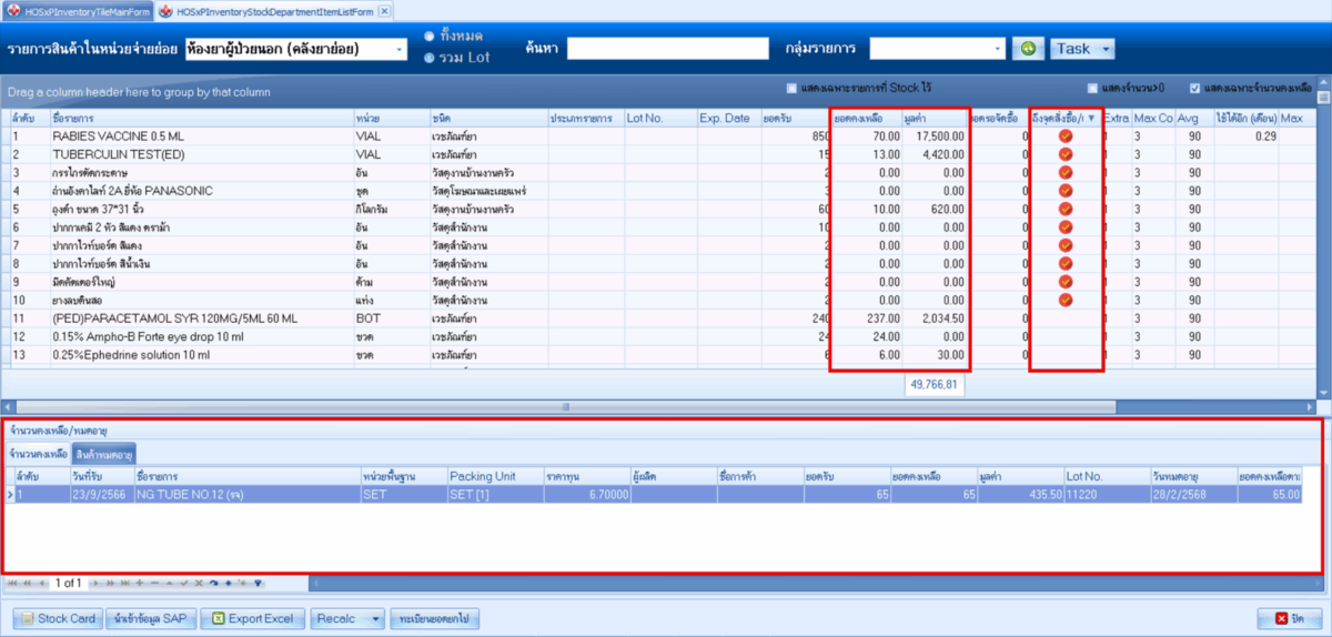 BMS INVENTORY ระบบตรวจสอบสินค้าในคลังย่อย ระบบรายการสินค้าในหน่วยจ่าย มีความสามารถ ดังนี้ สามารถตรวจสอบรายการจ่ายให้ผู้ป่วยได้โดยมีชื่อของผู้ป่วย แสดงให้เห็นใน Stock Card (กรณีใช้ระบบตัดจ่ายแบบ Real time)สามารถตรวจสอบข้อมูล Stock Card ได้และ Export เป็นไฟล์ Excel ได้สามารถตรวจสอบวันหมดอายุของสินค้าตามช่วงวันที่ได้สามารถดูยอดสินค้าในคลังได้ แสดงหน้าจอทะเบียนรายการสินค้าในหน่วยจ่าย แสดงหน้าจอ Stock Card ของรายการสินค้า เอกสารแบบฟอร์ม Stock Card ← ย้อนกลับ